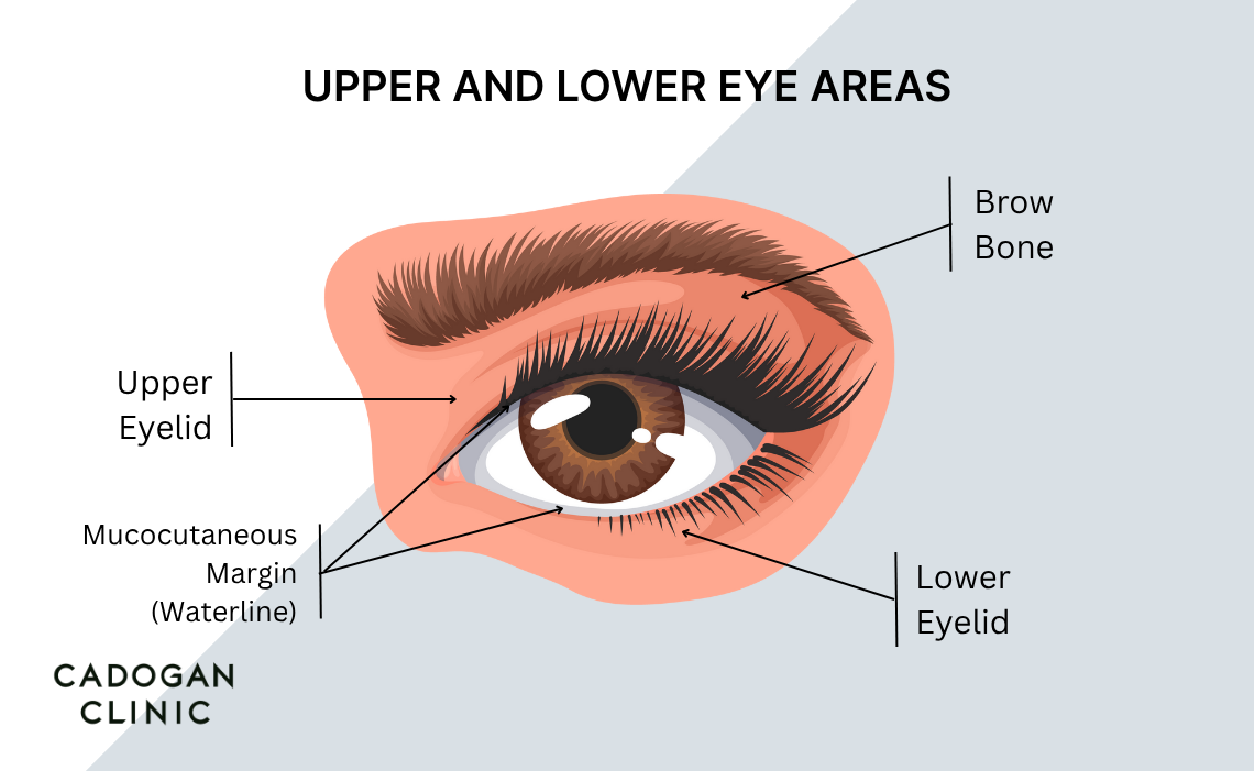Lower Blepharoplasty addresses the lower eyelid and eye socket area, extending down to the top of the cheekbone.