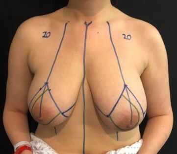 One of the most common scarring patterns for Breast Reduction is an anchor pattern, resulting in scarring around the nipple with a vertical line down the breasts, and a horizontal line under the breast. An increasingly popular approach results in only a vertical line down the lower half of the breasts, however this approach is not always suitable for patients with extremely large breasts.